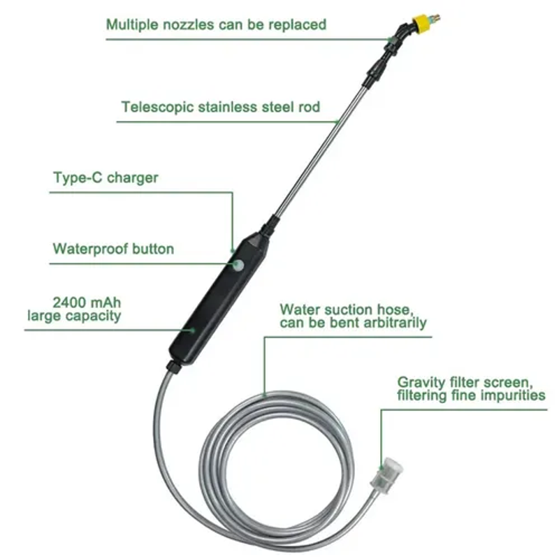 Powered by a 2400 mAh lithium-ion battery, it delivers up to 3 hours of continuous spraying on a single charge. Recharge anytime with the USB Type-C cable, even using a phone charger or power bank.